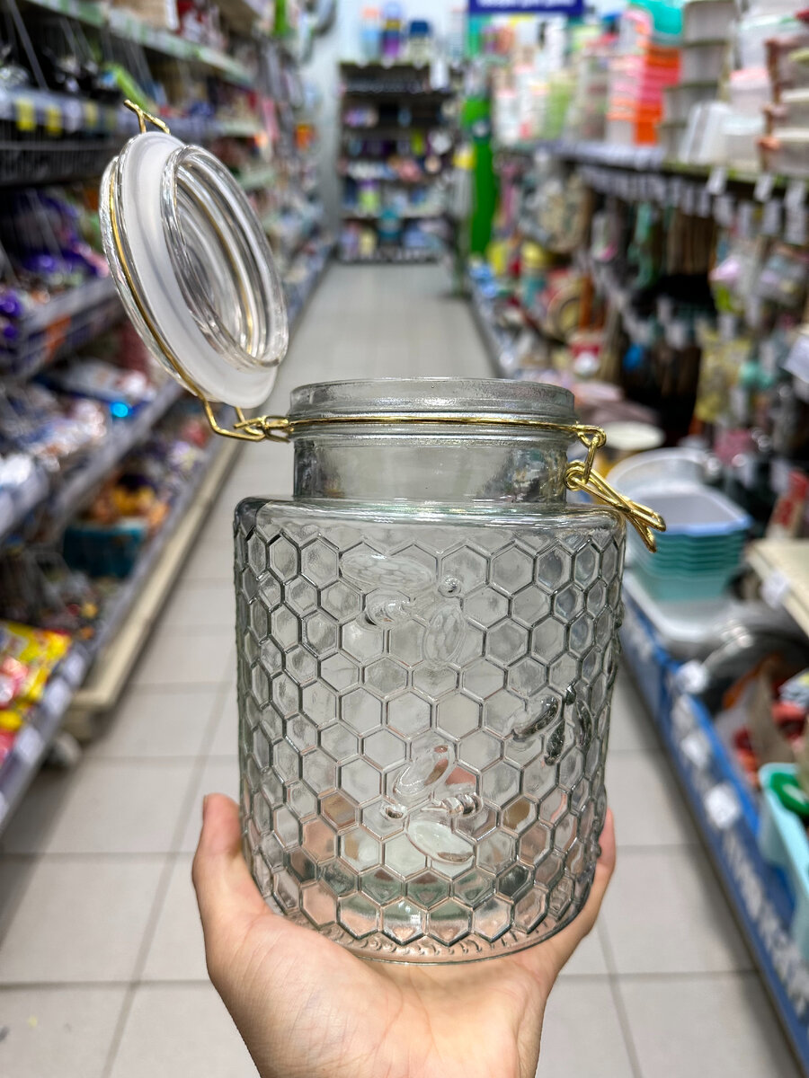 Всем здравствуйте! Лето не заканчивается и продолжаются летние новинки, их много в обзоре. Сначала посмотрите, какие привезли красивые баночки для хранения. На стекле выбит "медовый" рисунок в виде сот с пчелками. Золотистый замок поможет плотно закрыть банку. Цена 199 руб. за объем 1,5 л. Для сравнения добавляю похожие емкости с замком, но попроще. Они тоже сейчас продаются в "Фикс Прайс". Набор пластиковых ёмкостей для специй на подставке за 149 руб. еще одна хорошая новинка. В наборе 3 банки, внутри каждой находится ложка. Поселились на прилавках яркие тапочки, хлопковый верх и стелька (199 руб. ) К ним в соседи пришли тоже хлопковые женские комбинезоны (349 руб.,) и трикотажные топы приятные на ощупь. Качество соответствует цене. Нашла чехол для обуви большой и вместительный, который поможет организовать порядок в шкафу. С прозрачным окном и 4 карманами. Цена 199 руб. И еще новые коробки для хранения с ручками 26*26*26 см за 149 руб. Быстро распродаются у нас шторы для ванной.