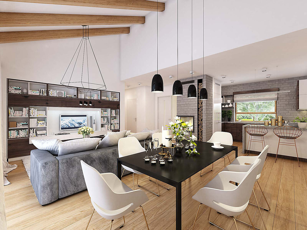 Как обустроить кухню-гостиную 44 м² в доме Бьорк? Используйте все преимущества планировки, чтобы пространство стало местом притяжения всей семьи. Разместите рабочую поверхность кухни вдоль окна Наслаждайтесь видом и готовьте при естественном свете. Не забудьте продумать установку римских штор или жалюзи. Добавьте дополнительную полезную поверхность – кухонный островок. Поставьте к нему пару удобных барных стульев. Обеденный стол с видом на природу Выбирайте большой стол из качественных натуральных материалов. Он станет центральным объектом вашего интерьера и создаст атмосферу семейного тепла. Расположите стол у панорамного окна, которое ведет на террасу дома. Большой диван в зоне гостиной Чтобы добавить комфорта, рекомендуем разместить большой диван в гостиной. Это идеальное место для семейных вечеров, просмотра фильмов или отдыха после ужина. Дополните зону отдыха прямоугольным ковром нейтральных оттенков. Камин – сердце загородного дома Добавьте загородной романтики в ваш дом, обустр