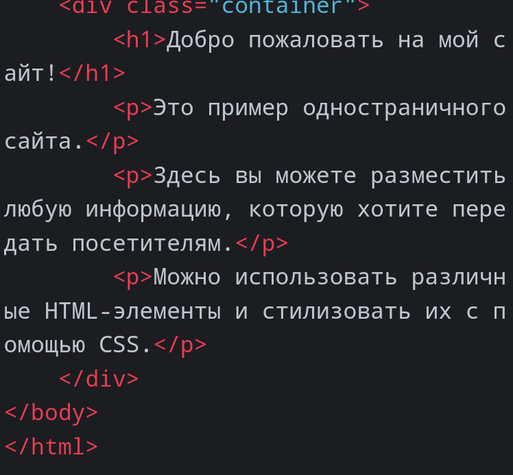 Вот простой пример HTML-кода для создания одностраничного сайта: ```html <!DOCTYPE html> <html> <head> <title>Мой одностраничный сайт</title> <style> /* CSS стили для страницы */ body { font-family: Arial, sans-serif; margin: 0; padding: 0; } .container { max-width: 800px; margin: 0 auto; padding: 20px; } h1 { text-align: center; margin-bottom: 30px; } p { margin-bottom: 25px; } </style> </head> <body> <div class="container"> <h1>Добро пожаловать на мой сайт!</h1> <p>Это пример одностраничного сайта.</p> <p>Здесь вы можете разместить любую информацию, которую хотите передать посетителям.</p> <p>Можно использовать различные HTML-элементы и стилизовать их с помощью CSS.</p> </div> </body> </html> ``` Приведенный выше код создает страницу с контейнером, в котором расположены заголовок (`h1`) и несколько абзацев (`p`). Вы также можете изменять стили (цвет