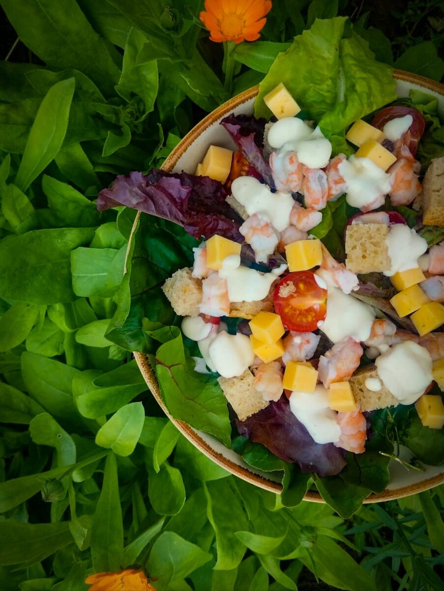 Самый знаменитый салат. В ресторанах его заготавливают десятками, а в некоторых и сотнями порций на день. Очень простой, вкусный и сытный. Самое главное сделать соус самому из качественных ингредиентов. Креветки можно заменить куриной грудкой. Грудку варим или обжариваем. Что же вам нужно на 1 порцию: Листы салата 6шт Креветки 150г Томаты черри 150г Любой твердый сыр 50г Сухари из белого хлеба 50г Соус цезарь 50г Для соуса цезарь нужно: Анчоусы 60г Каперсы 20г Соус ворчестер 20г Желток 100г Горчица 60г Лимонный сок 15 Масло растительное 715г Соуса у вас получится 970г. Можете часть заморозить или сделать половину. Но зная его вкус, могу вас уверить, он будет съеден быстрее, чем испортится. Хранить не более 2 суток. Что делаем: Сначала соус. Анчоусы, каперсы и ворчестер пробить блендером до однородности. Желтки, горчицу, лимонный сок взбивают до однородности. Как только получилась однородная масса, начинайте вливать тонкой струйкой растительное мас