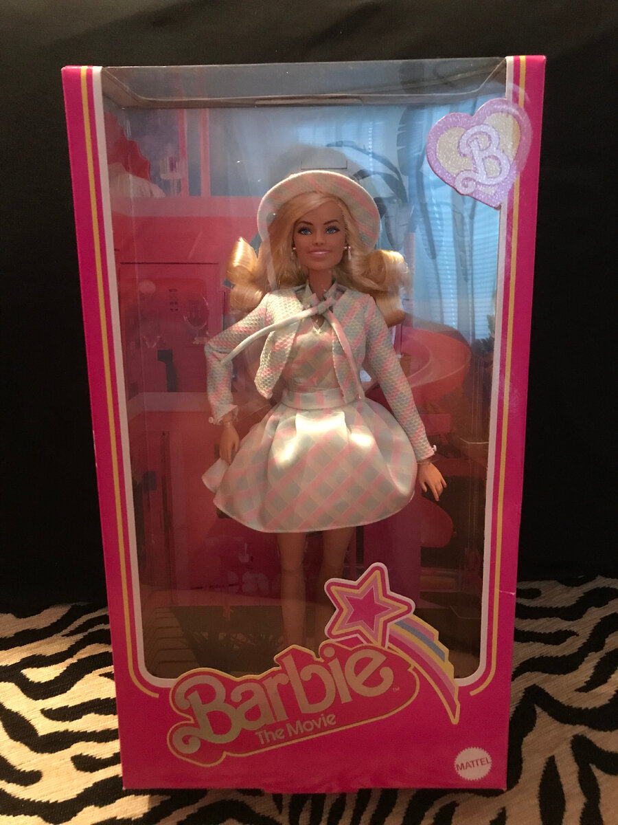 Наконец-то я добралась до Марго😍 и распаковала ее. Для начала осмотрим коробку. Передняя часть коробки розового цвета с логотипом фильма и компании Mattel. Задняя часть представлена кадром из к/ф Барби с изображением Марго Робби в образе Барби. Сбоку коробки изображение дома Барби и логотип фильма. Кукла закреплена на картонной подложке с изображением лужайки у дома Барби. Наряд выполнен из мягкой ткани, ткань очень приятная на ощупь. Все застёжки выполнены в виде пластиковых кнопок. На руках куклы нежный розовый маникюр. Обратите внимание- на пиджаке рукава пришита маленькая белая пуговичка (Matell меня очень приятно удивил). На ногах куклы голубые босоножки (каблук устойчивый и не сгибается под весом куклы), педикюра на ногах нет, но есть пальчики. Тело куклы имеет клеймо 2015 год, пластик по ощущению очень качественный, даже если сравнивать с Barbie Tooth fairy, которая на повитальном теле. По подвижности напоминает экстру, но по качеству даже близко -нет. На теле нет фабричных
