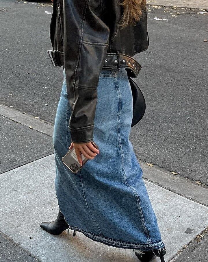 Все признаки приближения этого тренда были налицо: постоянный отсыл к одежде из 90-х, рост популярности длинных юбок, неразбериха по поводу того, какая форма джинсов станет следующим «тем самым» стилем и т. д. Поэтому мало кто удивился тому, что на стритстайл фото стали появляться наряды с длинными джинсовыми юбками. Этот тренд начал появляться повсюду с начала 2023 года. Классические синие и голубые, либо же выбеленные частично хлором, или вываренные, подшитые снизу и рваные с бахромой, с прямым силуэтом или оборванным по диагонали, с разрезами и без, с объемными накладными карманами или классическими, с имитацией перешитой юбки из старых джинс, на молнии, пуговицах или кнопках, юбки из кусков джинсы, белая и черная джинса…. Длинные, миди или укороченные, прямые или сшитые “русалочьим хвостом”… Надев любую джинсовую юбку в этом сезоне, вы «рискуете« прослыть стильной штучкой.