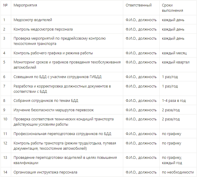 Стандартное по положение об обеспечении БДД на предприятии включает в себя: