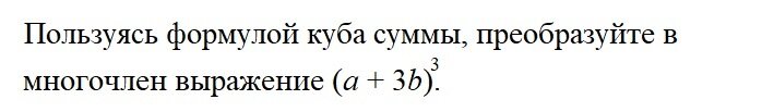 Куб суммы и куб разности двух выражений Уважаемые мамы и папы, дедушки и бабушки! На примерах решений номеров № 827 ( в ) и 828 ( в ) из 8-го издания учебника по алгебре для 7-го класса авторов Ю. Н. Макарычева, Н. Г. Миндюк, К. И. Нешкова и С. Б. Суворова под редакцией С. А Теляковского предлагаю вспомнить возведение в куб суммы и разности двух выражений. № 827 ( в ): Решение: В главе V §12 п. 32 учебника на странице 165 даётся тождество, которое называют формулой куба суммы: куб суммы двух выражений равен кубу первого выражения плюс утроенное произведение квадрата первого выражения и второго плюс утроенное произведение первого выражения и квадрата второго плюс куб второго выражения. Доказательство этой формулы приводить не будем – это уже сделали авторы учебника (при этом они использовали правило умножения многочлена на многочлен), а просто используем её для решения нашего примера: № 828 ( в ): Решение: В главе V §12 п. 32 учебника на странице 165 даётся тождество, которое называют ф