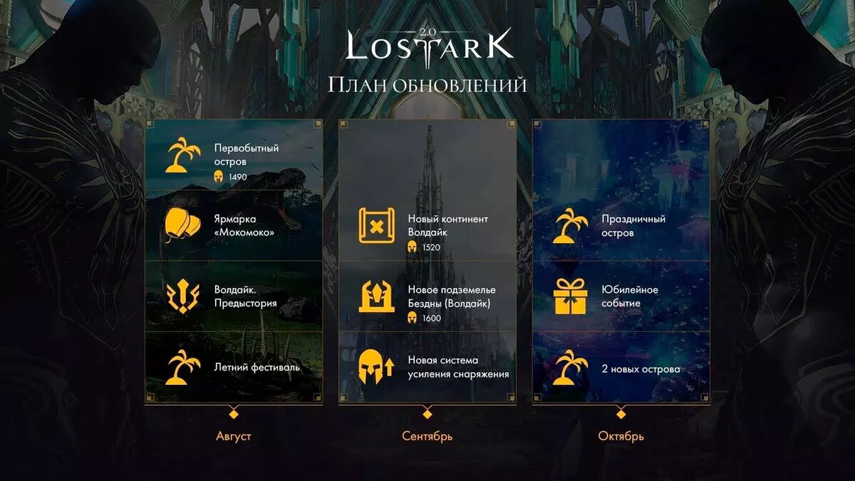 18 июля компания Astrum опубликовала план обновлений Lost Ark на август-октябрь 2023 года. Героев ждёт приключение на новых территориях и множество ивентов, включая мероприятия к грядущему Дню рождения Лост Арк. План согласован с разработчиками из Smilegate RPG, что гарантирует выпуск контента в сроки. Предстоящие новинки раскрыты в формате тезисов: - Август: Первобытный остров, Волдайк (предыстория), Летний фестиваль и Ярмарка "Мокомоко"; - Сентябрь: Новый континент Волдайк, подземелье Бездны, система усиления снаряжения; - Октябрь: Юбилейное событие и три острова. 26 июля в игре установят обновление "Эпоха иллюзий" со второй частью "Фестиваля Махараки" и рейдом на эпохальную версию Владыки Аврельсуд. Новость на сайте: https://topinator.ru/1288-pervobytnyj-ostrov-i-kontinent-voldajk-v-lost-ark.html