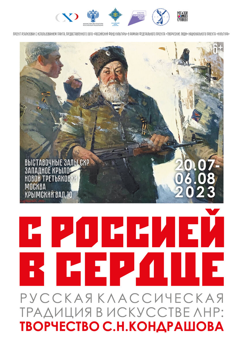 Союз художников России продолжает долгосрочную программу знакомства российского общества с изобразительным искусством Донбасса. 20 июля 2023 года в выставочных залах СХ России на Крымском Валу будет представлено творчество народного художника ЛНР, лауреата премии имени И.Е. Репина (2012), премии «Прохорово поле» в области изобразительного искусства (2013), профессора Академии культуры и искусств имени М.Л. Матусовского Сергея Николаевича Кондрашова. С.Н. Кандрашов окончил мастерскую легендарного живописца Е.Е. Моисеенко Института живописи, скульптуры и архитектуры им. И.Е. Репина Академии художеств СССР в Ленинграде. После учебы, он – ростовчанин, по распределению приехал в Луганск. Здесь и созданы все его произведения. Луганщина стала его второй малой родиной. Даже в самые тревожные дни он не допускал мысли об отъезде из ЛНР. Твердо уверенный в своей гражданской позиции, художник продолжает своим искусством преданно служить народу ЛНР, России. В последние годы он сфокусировал в свои