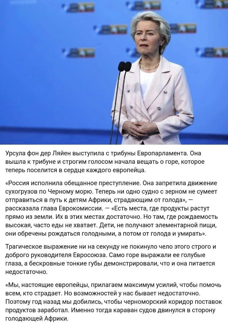 Вот на что я человек не впечатлительный, а прослезилась. Ну как так было можно? Весь мир, можно сказать, в едином порыве стремился накормить бедных африканских детей, а настоящие европейцы - ну, те, из цветущего сада - руководили процессом. Они показывали, как надо правильно жевать и глотать, как пользоваться ножом и вилкой, и какой рукой вытирать нос салфеткой. Они помогали тем, кто страдает, понимаете? Всем, чем могли. Они добились, чтобы голодающая Африка напиталась зерном. Правда, почему-то большая его часть ушла в ту самую Европу, но это вторично. Африке же тоже что-то досталось, насколько я знаю? И нечего тут считать. Но случилось страшное! Россия обещала - Россия сделала. И теперь никакие сухогрузы в Африку не пойдут. И в Европу - тоже. И дети обречены рождаться голодными. Видите, что творится? А вы сидите и хихикаете вместо того, чтобы осудить. Такое впечатление, что только у Урсулы за этих детей голова и болит. Что вы за люди?