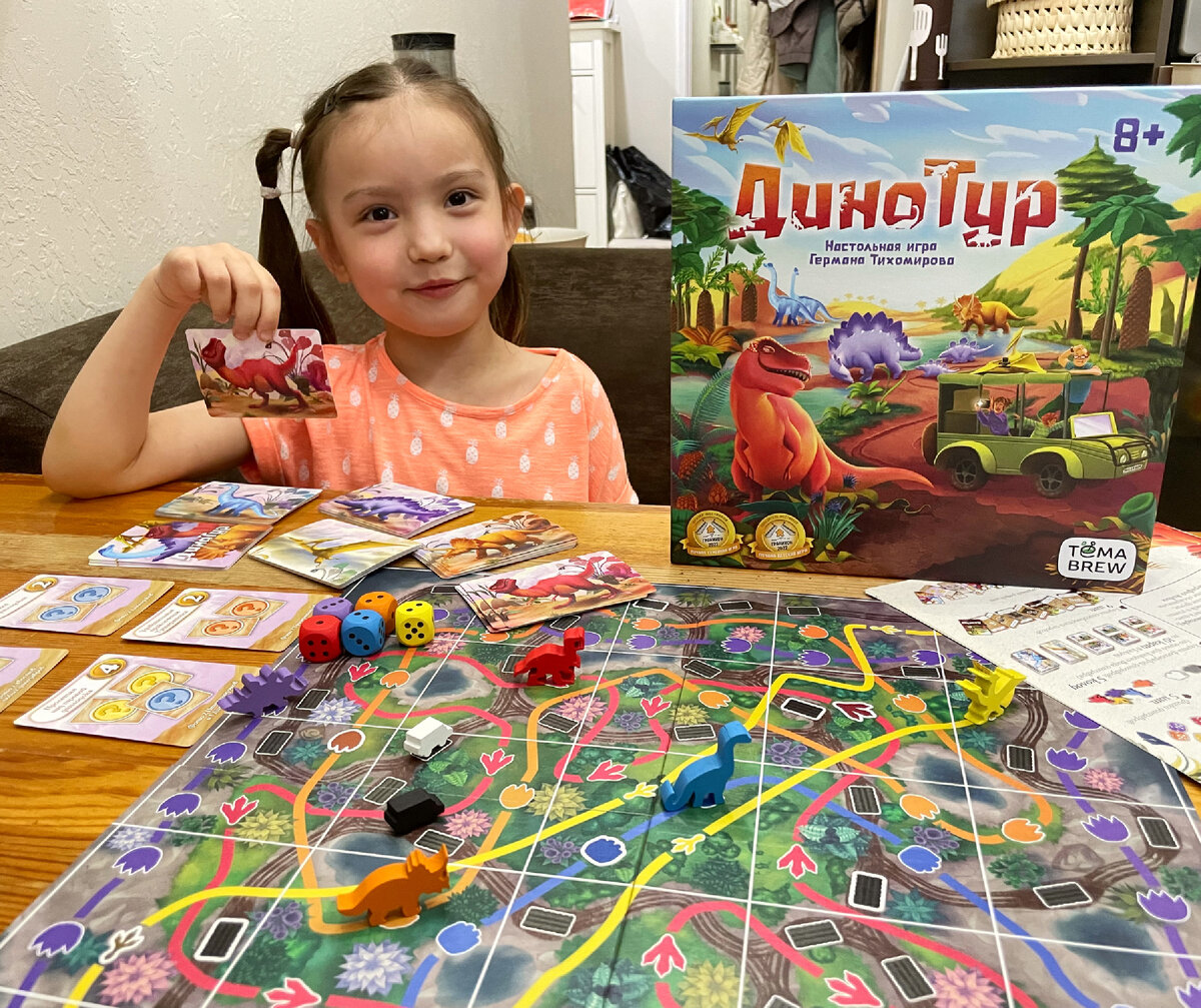 Мы с Никой планировали сыграть в «Динотур» ещё пару партий перед постом, но что-то лето предложило настолько насыщенный график, что я поняла — пора уже рассказывать об игре прямо сейчас 🤪 «Динотур» — довольно простая игра, несмотря на маркировку «8+»: Ника довольно быстро освоилась с правилами (мы играли без спецспособностей автомобилей), вопросы были только к тактике — ходы она совершала не всегда оптимальные. Игра про фотографов, которые пытаются собрать материалы для журнала про свежеоткрытый остров динозавров. Сбор фотоматериалов — это механика сет-коллекшена в игре. Например, вы можете получить 3 ПО, если сфоткаете два раза жёлтого и один раз красного динозавра — или два раза хвосты динозавров (и так далее). Цели касаются цветов динозавров и частей тела (голова, туловище, хвост) — и, кстати, именно с ним связана самая забавная находка игры) Дело в том, что динозавры двигаются по определённой траектории всю игру. Сложнее всего двигается птеранодон — он летает стремительно, и оказа