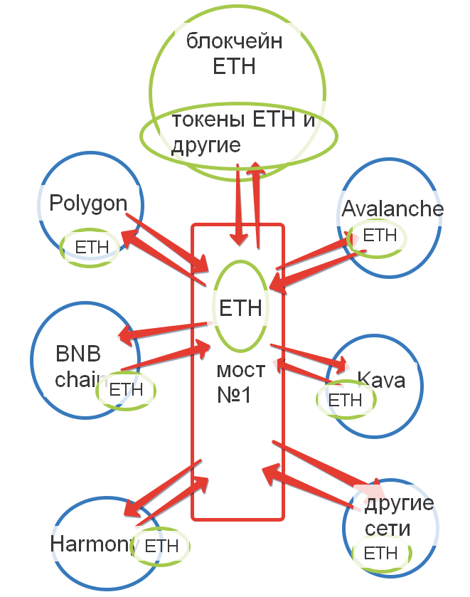 Например: В сети ETH заблокировано 1 млн ETH в трёх мостах. В другую сеть пришло 1 млн ETH в трёх мостах пропорционально.
