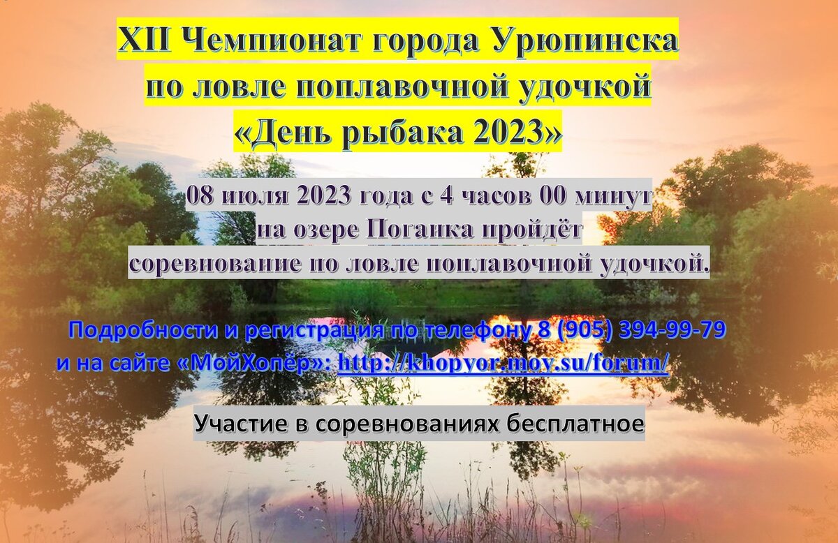 8 июля в городе Урюпинск на озере Поганка прошли соревнования по ловле на поплавочную удочку "День рыбака 2023". Соревнования были организованы Клубом рыбаков Прихопёрья, отделом молодежной политики, физической культуры и спорта администрации городского округа г. Урюпинска.