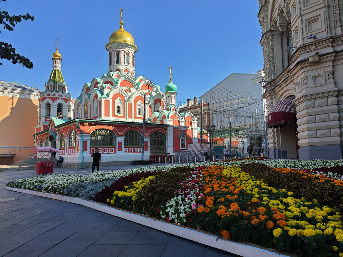 Главный универсальный магазин постоянно устраивает точки притяжения для покупателей и гостей Москвы. Это очень приятно -- прийти на Красную площадь и увидеть красиво оформленный цветочными клумбами ГУМ. Цветы придают хорошего настроения и никого не оставляют равнодушным. Ранним утром здесь как-то особенно красиво и уютно. По площади плывёт колокольный звон. И есть ощущение невероятного умиротворения. А ещё в ранний утренний час на площади довольно много туристов. В основном это семьи с детьми, которые в Москве проездом к морю или уже возвращаются домой, и купили билеты на поезд с расчетом погулять по Москве несколько часов. И это очень правильное решение! Москва приветлива и дружелюбна. И показывает все свои красоты. А этих красот только в районе Красной площади хватит на полдня просто погулять. А уж если на экскурсию в Кремль пойти, то одним днём не обойтись. Можно отправиться в парк "Зарядье", сфотографироваться на стеклянном мосту, а по дороге в Александровский сад посидеть в тенеч