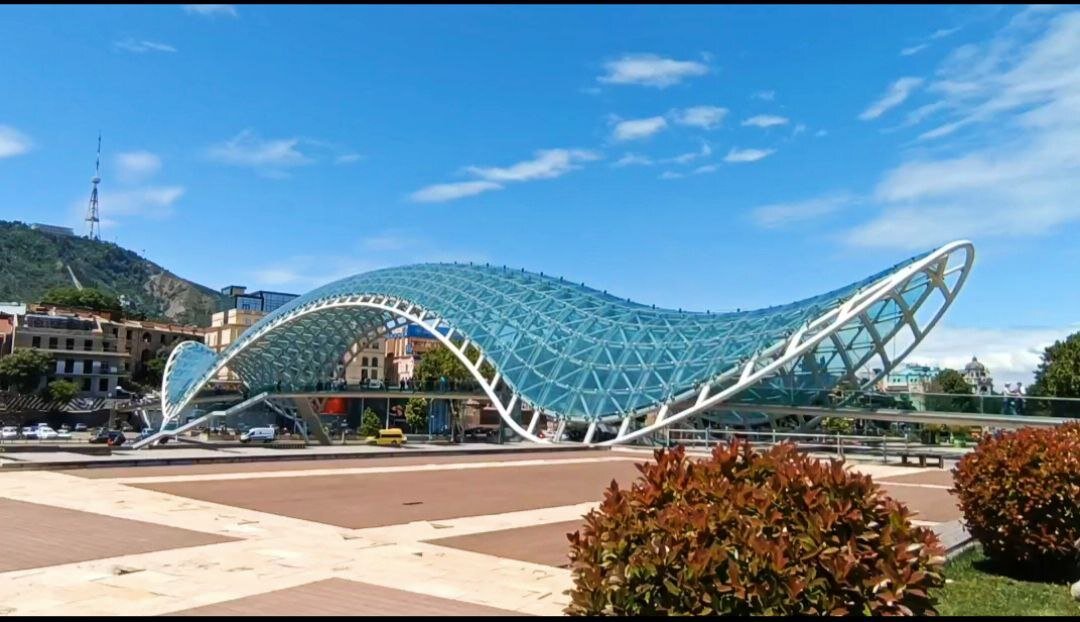 Мост Мира- это пешеходный мост в Тбилиси через реку Кура, оффициально открывшийся в мае 2010 года, соединяет Старый Город Тбилиси и парк Рике. Построен по инициативе Михаила Саакашвили при поддержке столичной мэрии. Реализовал проект итальянский архитектор Микеле де Луки. Идея создания моста навеяна грузино-осетинским конфликтом 2008 года и олицетворяет переход страны от исторического прошлого к её лучшему будущему. С моста хорошо видна старинная церковь Мехети, возвышающаяся над Курой в Старом Городе, у ее подножия возведен конный памятник основателю Тбилиси царю Вахтангу Горгасалу. Из Италии в Грузию конструкцию моста привезли в разобранном виде, собирали и монтировали на месте. Мост полностью создан из стали и имеет четыре мощных опоры, сверху накрыт большим стеклянным куполом, длиной каркаса 156 метров, а шириной 5 метров. С наступлением вечера, мост освещается множеством лампочек. Каждый час они своим мерцанием, при помощи кода Морзе, переда