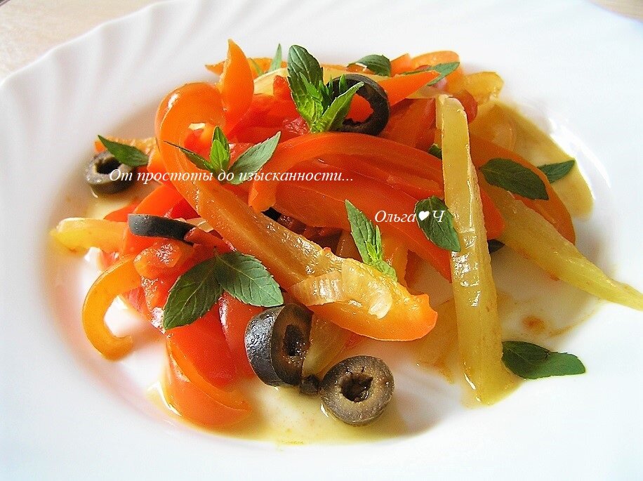 мята Приготовление: Перец нарежьте полосками (лучше предварительно запечь и снять кожицу). Помидоры нарежьте кубиками. Лук произвольно нарежьте, обжарьте на оливковом масле, добавьте винный уксус, сахар и помидоры, перемешайте. Выложите перец, изюм... нарезанный чеснок... каперсы. Посолите, поперчите по вкусу. Тушите минут 15, затем дайте на