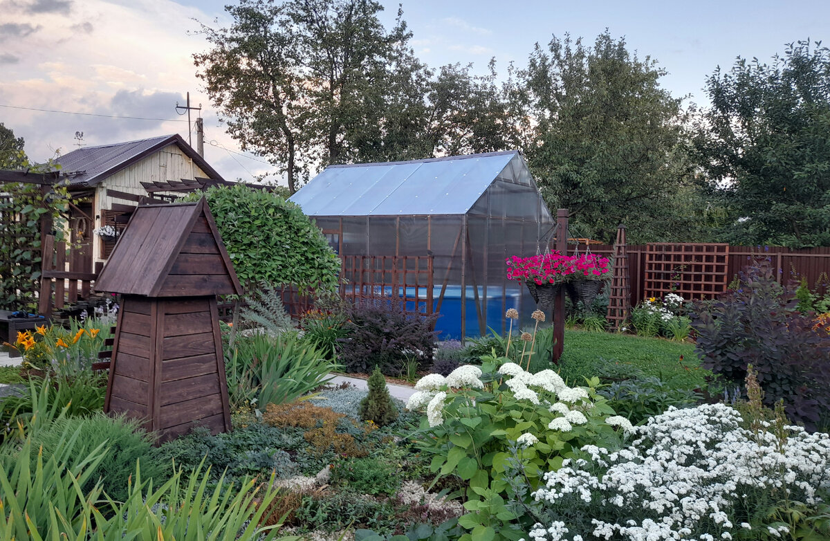 Этим летом мы еще ни разу не купались. Во время строительства павильона было несколько жарких дней, но воду из бассейна пришлось слить. Павильон мы доделали. Он получился таким, каким я его и задумала. Высокий, прозрачный и добротный. Он конечно не украсил участок, но, на мой взгляд, и не изуродовал. Дверь павильона открывается внутрь. Она ничему не мешает. У входа временно образовалась банно-прачечная зона. Здесь мы купаемся и стираем. Раньше занимались этим в углу участка за теплицей. На другой стороне я оборудовала вешалку для одежды и полотенец. Дверь закрывается на шпингалет и крючок под старину. В павильоне всегда тепло, даже вечером и утром. Сегодня вечером на улице было +18 и сильный ветер, а в павильоне +25 и тихо. Воду в бассейн мы вчера доливали и она была холодной. Сегодня она уже +25 градусов. Воды в бассейне еще маловато, но я захотела искупаться и открыть купальный сезон 2023 года. Вид из бассейна уже не тот, что раньше. Цветами и небом уже не полюбуешься. Но лучше так,