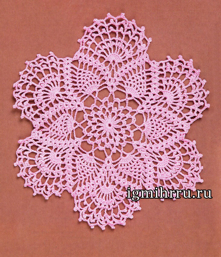 Нежнейшая розовая салфетка с узором ананасы. Вам потребуется: 20 г пряжи розового цвета «Ирис» (100% хлопок), крючок № 1,6. ОПИСАНИЕ РАБОТЫ Вяжите салфетку по схеме. Готовую салфетку растяните, булавку вколите в каждую арку из «пико». Оставьте под влажной тканью до полного высыхания. Если вам понравилась эта статья оставьте свой комментарий. Магазин пряжи ВЯЗАНЫЙ.РФ