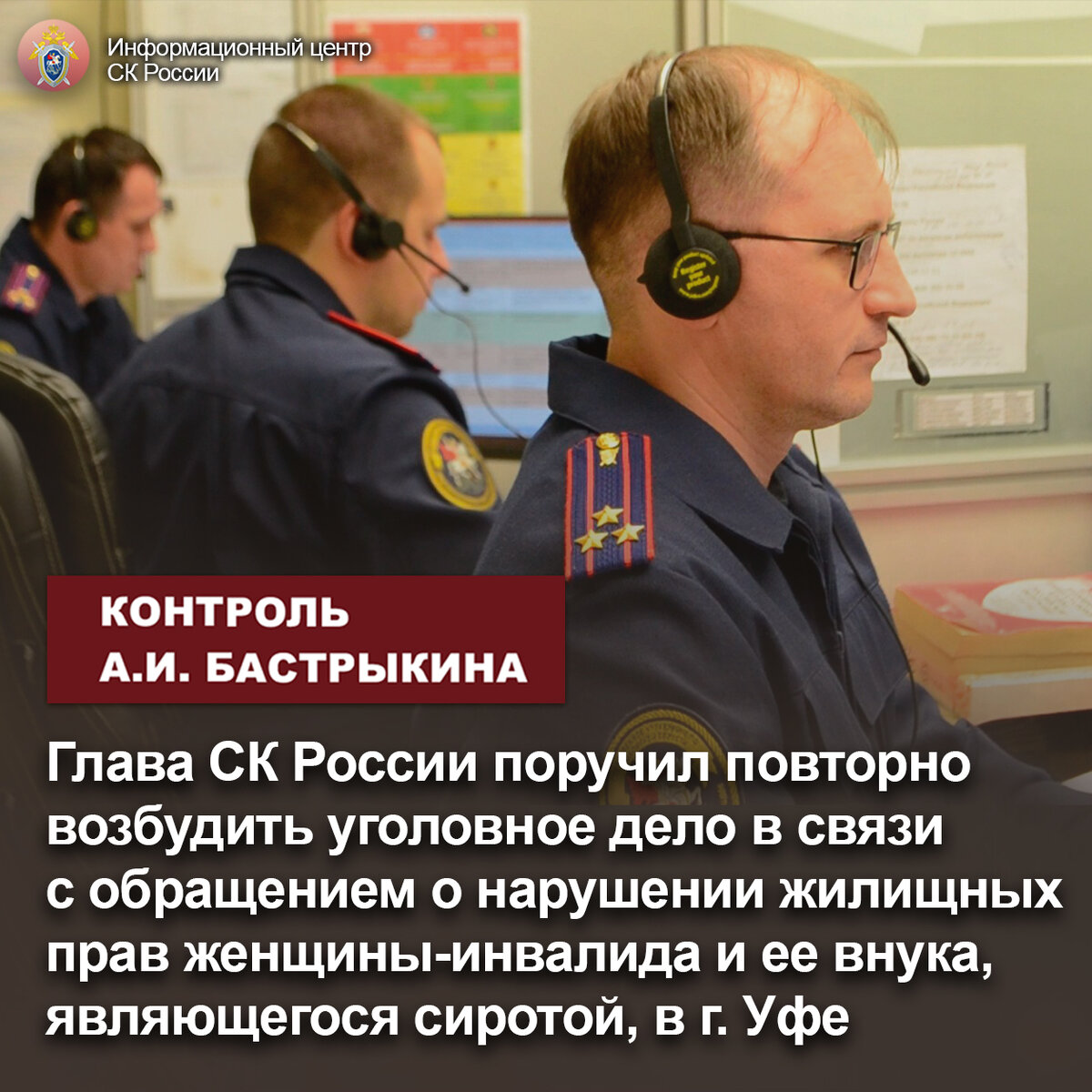 Глава СК России поручил повторно возбудить уголовное дело в связи с обращением о нарушении жилищных прав женщины-инвалида и ее внука, являющегося сиротой, в г. Уфе