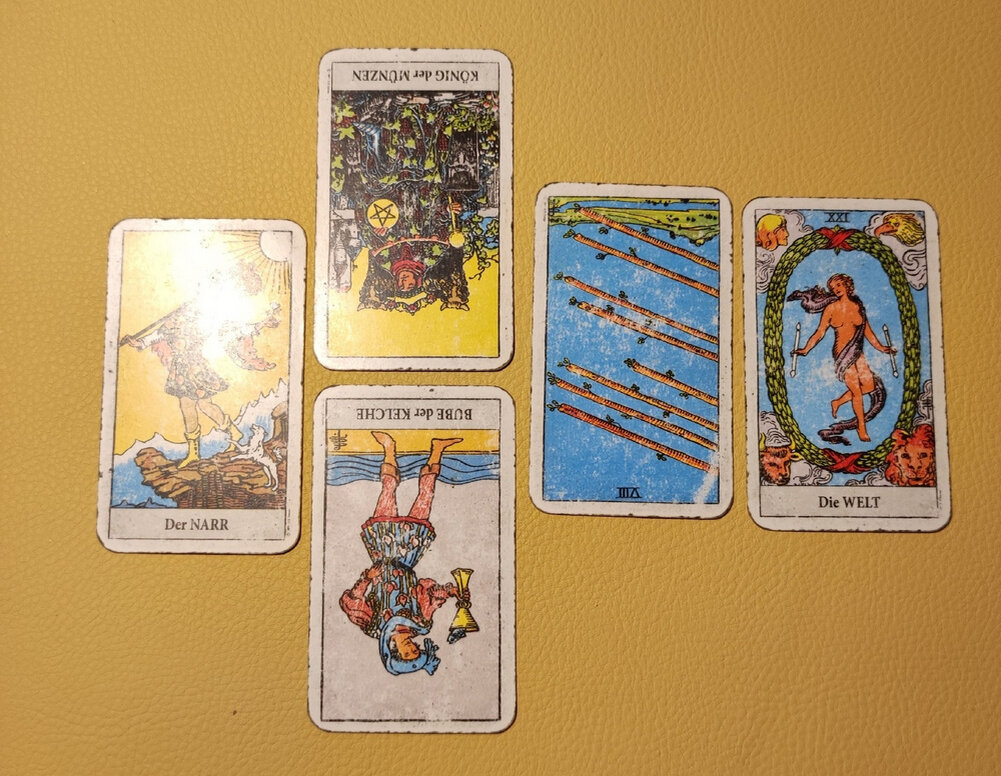 Будет ли третья мировая в**на? Нет, не будет. Но есть условие. Если позволит старая карма. Посмотрите, какой переход - от Шута (старая карма) к Миру (будущая карма). Давайте представим, что прямо сейчас мы изменились. Перестали мусорить и хамить, угрожать и указывать другим, что им нужно делать, если они, конечно, не нарушают порядок и общественный покой, не бросают детей, не обижают беззащитных, не воруют, не врут. Надеюсь, успеем. Судя по картам. Паж кубков перевернут - надо перестать вставать на позицию обиженного ребенка, за которого все должны это сделать. Король пентаклей перевернут - тот, с которым договаривались о деньгах больше их не имеет. А дальше? Плохие новости и кризис по перевернутой восьмёрке жезлов. Но, наверное, ситуация именно такая, никто просто, наверное, и не представляет тот масштаб общего ущерба, который происходит. И вот когда придет это понимание, откроется новая дверь.