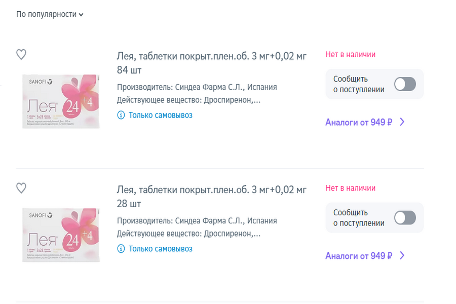 В аптеках города наблюдается дефицит препарата «Лея. С неожиданной проблемой столкнулись сибирячки, которые пока не спешат повышать рождаемость в регионе. Последние несколько дней на сервисах eapteka.ru и Lekvapteke исчез из продажи противозачаточное средство «Лея». Препарата нет в наличии ни в аптеках, ни на складах.Последняя стоимость упаковки на 28 таблеток — 616 рублей, на 84 таблетки — 1409 рублей. Аналоги предлагаются уже по более завышенной цене: от 949 рублей за пачку с 28 таблетками, а упаковка с 84 таблетками обойдется как минимум в 2600 рублей.Напомним, что ранее новосибирцы столкнулись с проблемой отсутствия препаратов от диабета «Оземпик» и «Ребелсас» в аптеках.В начале июля «Оземпик» в городе можно было найти только в двух местах. Однако продавец просил за одну упаковку с дозировкой 1,34 мг — 29 800 рублей.Ранее редакция сообщала о том, что в Минпромторге рассказали почему в Новосибирске пропали два лекарства для диабетиков. Иллюстрация: скриншот с сайта eapteka.ru Автор