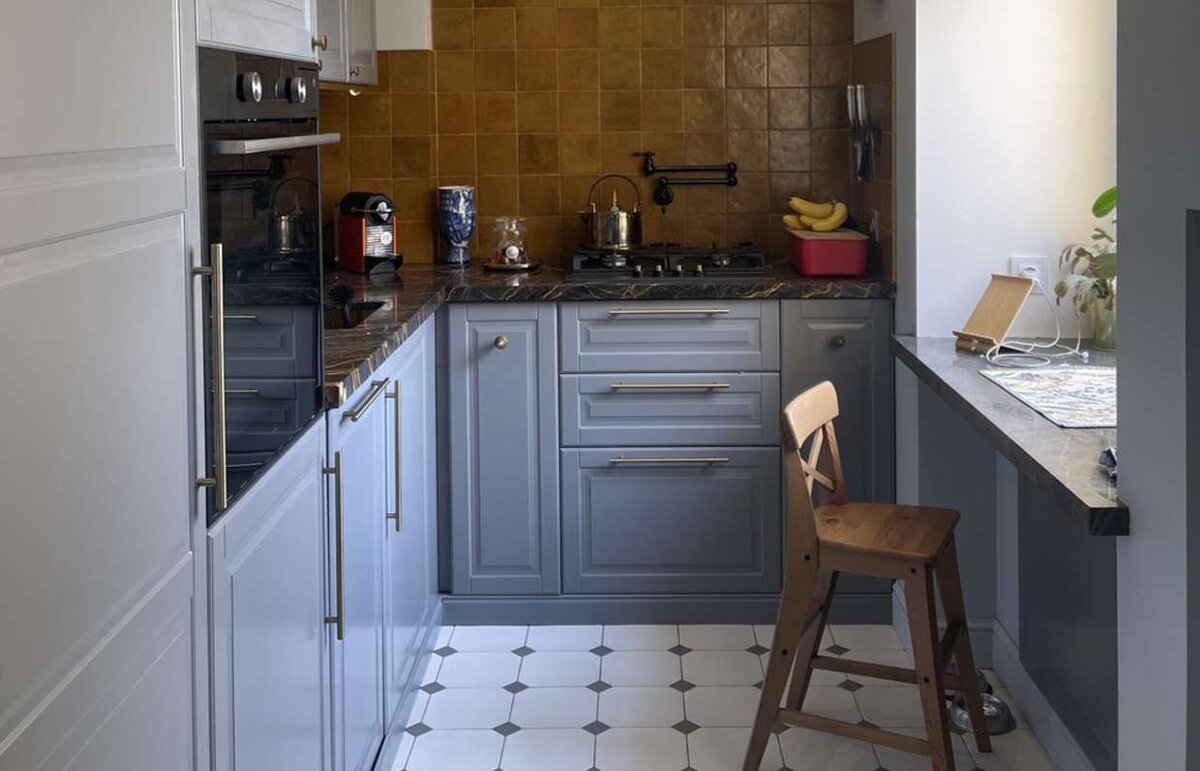 Я использовала две прикроватные тумбочки: тогда я только начинала реставрировать деревянную мебель. На этапе планировки решили, что здесь будет рабочее место: предусмотрели нишу. Следующий лайфхак — шкаф над техникой — кухонный. За счет черного основания он не угадывается.