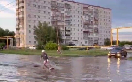 После мощного ливня, накрывшего 18 июля Оренбург, на улице Амурской на проезжей части образовалась река. Местные жители придумали, как себя развлечь… Водоемы после обильных и не очень дождей, коммунальных аварий, которые образуются в Южном микрорайоне города, совсем не новшество для местных жителей. Но и достучаться до властей, чтобы их лишили отнюдь ненужных бассейнов под открытым небом на проезжих частях, у горожан не получается. Оснащать дороги ливневками пока никто не собирается. Очередной мощный ливень, прошедший 18 июля, превратил улицу Амурскую в бурлящую реку, по которой пароходами ходили автомобили, ушедшие под воду по самые колеса. Правда, некоторые оренбуржцы не унывали, а отнеслись к порядком уже надоевшей ситуации с юмором. Они отважились прокатиться по воде на доске для серфинга. Встать на водную гладь у одного из «серфингистов» не получалось, должно быть, волна не та. Падал, промокал, но поднимался и резвился дальше. Другому горожанину покатушки всё-таки удал
