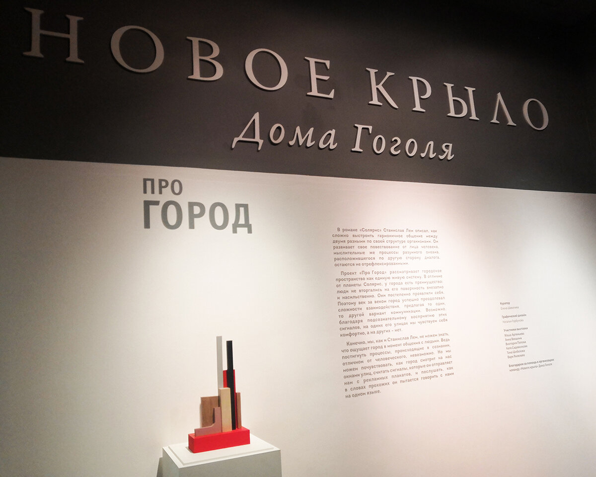 До 24 сентября в «Новом крыле» Дома Гоголя проходит выставка «Про город» под кураторством Елены Шевелевой. В основе выставки стихи Анны Векшиной, а преамбулой выступает идея из книги Станислава Лема «Солярис» о том, как сложно выстроить гармоничное общение между двумя разными организмами. Люди по-разному относятся к городу, бывает враждебно, бывает настороженно, кто-то жалуется, что в городе «нечем дышать». Куратору было обидно за Москву, в которой мы находимся 24/7, и ей захотелось «наладить мосты» взаимодействия между городской средой и человеком. Выстроить отношения посетителю помогают шесть художниц под кураторством Елены Шевелевой, а отправной точкой являются стихи одной из них. В первом зале основные экспонаты — это окна, через которые виден город и слышен его шум. Стены украшают цитаты жителей, записанные Анны Векшиной в аккаунте «Подслушано в Москве», на подиумах деревянные скульптуры-небоскребы, созданные из найденных или предназначенных на утилизацию материалов. Через шум из