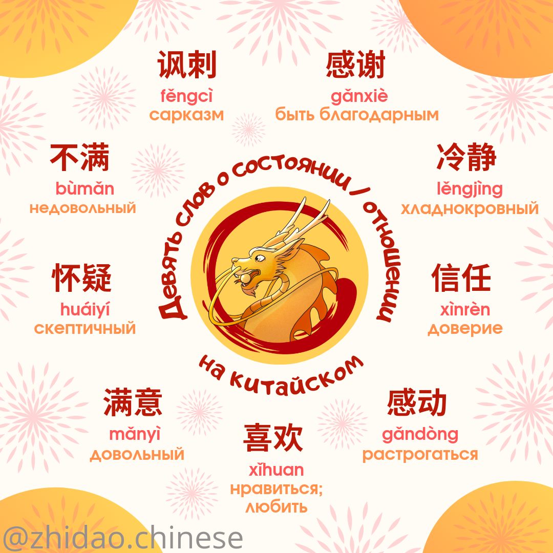 #zhidao_способы_сказать💭 Сегодня делимся с вами девятью словами для выражения состояния или отношения к чему-то 😉 1️⃣ 不满 bùmǎn недовольный 2️⃣ 讽刺 fěngcì сарказм; сатирический 3️⃣ 感谢 gǎnxiè быть благодарным 4️⃣ 冷静 lěngjìng хладнокровный, невозмутимый 5️⃣ 信任 xìnrèn доверие; доверять 6️⃣ 感动 gǎndòng растрогать, растрогаться 7️⃣ 喜欢 xǐhuan нравиться; любить 8️⃣ 满意 mǎnyì быть довольным; довольный 9️⃣ 怀疑 huáiyí подозрительный, скептичный 📝 Ссылка на карточки Quizlet для изучения новых слов: ❗В Quizlet вы можете послушать произношение всех фраз! Для этого нажмите на значок микрофона 🔊 📚 Хотите, чтобы Вы или Ваш ребенок заговорили на китайском? Напишите нам для записи на групповые / индивидуальные занятия! 🎓