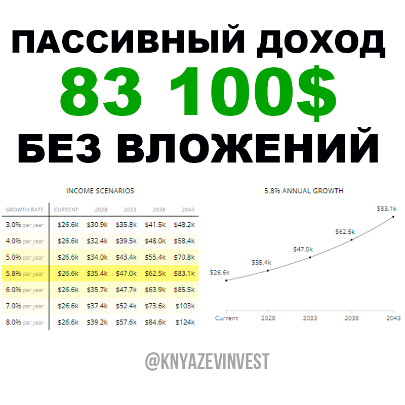 83 100$ в год без дополнительных вложений к 2043 году я могу ожидать получить по своему портфелю!