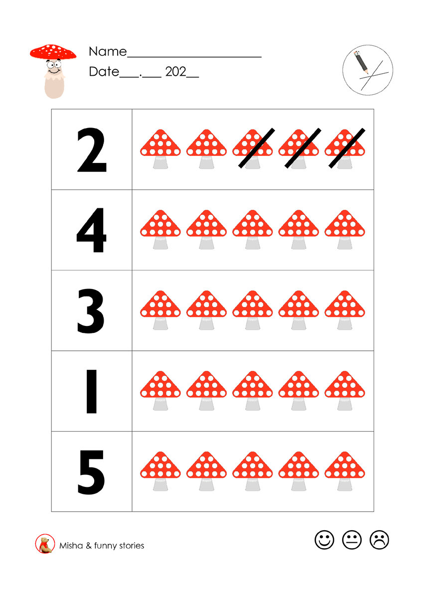 Распечатайте страничку и предложите ребенку задание. "Зачеркни в каждой строчке лишние мухоморы, так, чтобы осталось нужное количество."