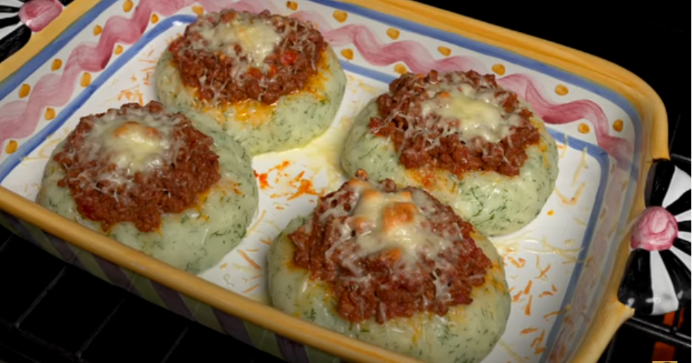 4) Картофельное пюре перемешать с укропом, разделить на 4 части, из каждой части скатать руками колобок, немного его придавить, чтоб была высокая лепешка, выложить 4 лепешки в форму, ничем не смазанную и сделать стаканом в лепешках углубления.