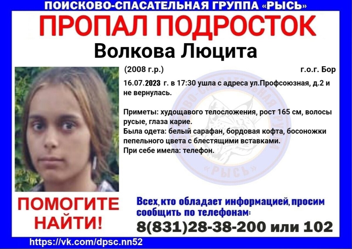 15-летнюю Люциту Волкову третий день разыскивают в Нижегородской области. Школьница ушла из дома на улице Профсоюзной на Бору вечером 16 июля и не вернулась. Об этом сообщили в группе поисково-спасательного центра «Рысь» в соцсети «Вконтакте». Волонтеры распространили ориентировки с приметами подростка. Они просят связаться с ними тех, кто обладает сведениями о местонахождении девочки. Телефон центра: 8 (831) 28-38-200. Ранее мы писали, что пропавшего вместе с отцом мальчика нашли живым. Информация об обстоятельствах исчезновения не уточняется. Напомним, что пропавшая 16-летняя школьница самостоятельно вернулась домой. Причиной ее ухода стали плохие оценки за экзамены.