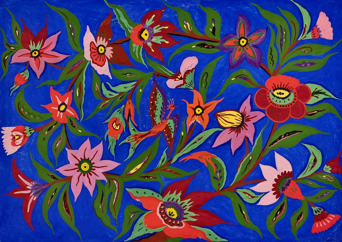 Снежана Черкаева Руководитель экскурсионно-массового отдела Карагандинского областного музея изобразительного искусства Лето - самая пора для показа этих удивительных работ, которые застыли в благоухании и цветении. Пахнущие птицы и поющие цветы в одном порыве создают звуки сказочного сада. Настоящая услада для глаз после сюжетных картин, после глубоких смысловых произведений, попросту отдыхаешь, наслаждаясь этим живым полем из переплетения цветов. «И пусть весь мир подождет», именно такие эмоции посещают при просмотре этих удивительных работ Марии Пантелеймоновны Буряк. Она родилась, в обычной деревенской семье, в которой царило творчество, впрочем, как и во всем украинском селе Ковалин. По окончании пятого класса в возрасте тринадцать лет, из-за болезни у неё отказали ноги. После чего увлечение рисованием превратилось в настоящее пристрастие. Руки не знали отдыха, и все в них ладилось - и шитье, и вышивка, и рисунок. Все вокруг неё начинало цвести изумительными цветами: платки, посте