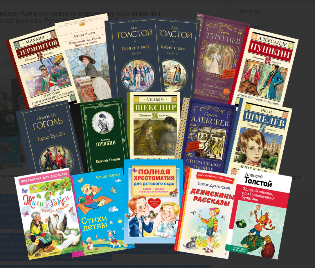 Сотрудники Национальной библиотеки имени Н. Г. Доможакова, Хакасской республиканской детской библиотеки и Хакасской республиканской специальной библиотеки для слепых собрали более 110 тыс. рублей. Это позволило закупить 407 экземпляров книг. Ведется работа по оформлению подписки на периодические издания. Кроме того, по заявке луганских коллег наши библиотекари оформили заказ на литературу для учащихся школ и воспитанников детсадов. В ближайшее время книги отправятся в ЛНР.