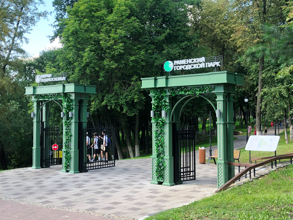 Этим летом в нескольких городах столичного региона проводились глобальные реконструкции парков в рамках губернаторской программы "Парки Подмосковья". Парки были закрыты довольно длительное время. В июле наконец-то открылся парк в Раменском. Я решила посмотреть, как его преобразили. Сразу скажу, парк без колеса обозрения я считаю неполноценным, а колесо как раз-таки и снесли :(. А оттуда открывались такие виды на Борисоглебское озеро и старинную фабрику! А ещё из парка убрали площадку военной техники, которая отличалась от большинства подобных музеев под открытым небом тем, что там разрешалось везде лазить :). Площадка была очень даже к месту, неподалёку от Вечного огня и мемориала на площади Победы (это у входа в парк). Теперь всё это торчит в центре города, что, на мой взгляд, вообще не в тему :(. А ещё из раменского парка убрали мини-ферму, а детям очень нравились животные... Однако обо всём по порядку. Теперь в парке всё в едином стиле - зелёное-ажурное. Вот, например, вход. Только