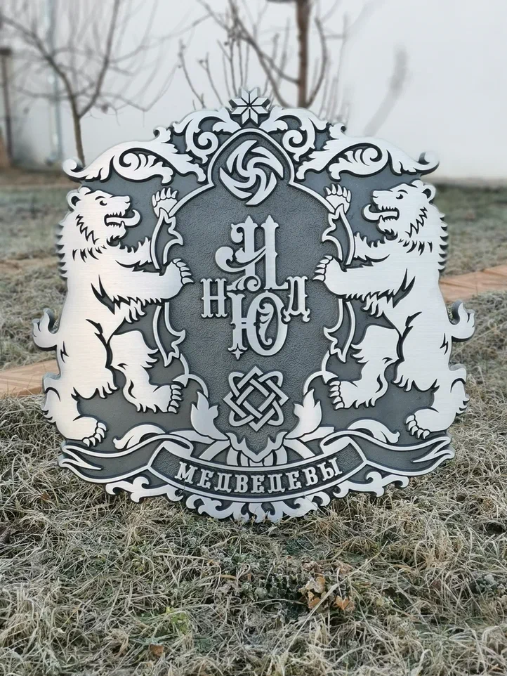 Традиции – не пустое для нас слово. Во всех наших работах прослеживается любовь к семье, любовь к стране, любовь к природе. Мы бережно “отливаем” эту любовь в изделиях, которые достойны того, чтобы стать семейными реликвиями. Именно в гербах индивидуальность вашей семьи может раскрыться особенно ярко! В гербовом искусстве боковые элементы носят название щитоносцев. Их роль часто играли различные существа – животные, люди, ангелы; они символизировали духовные силы, поддерживающие род, а иногда отражали особенность происхождения фамилия или род деятельности семьи. На гербе ГМ-14 щит с инициалами поддерживают медведи – суровые хищники, символизирующие силу, которая направлена на защиту вашего дома. В центре изображена монограмма из инициалов, которую мы разработаем персонально для вас. Ниже есть место для фамилии. В дизайне присутствуют и чисто декоративные элементы в виде лент, и растительные побеги. В композицию герба также добавлены древние символы, направленные на достижение равновеси