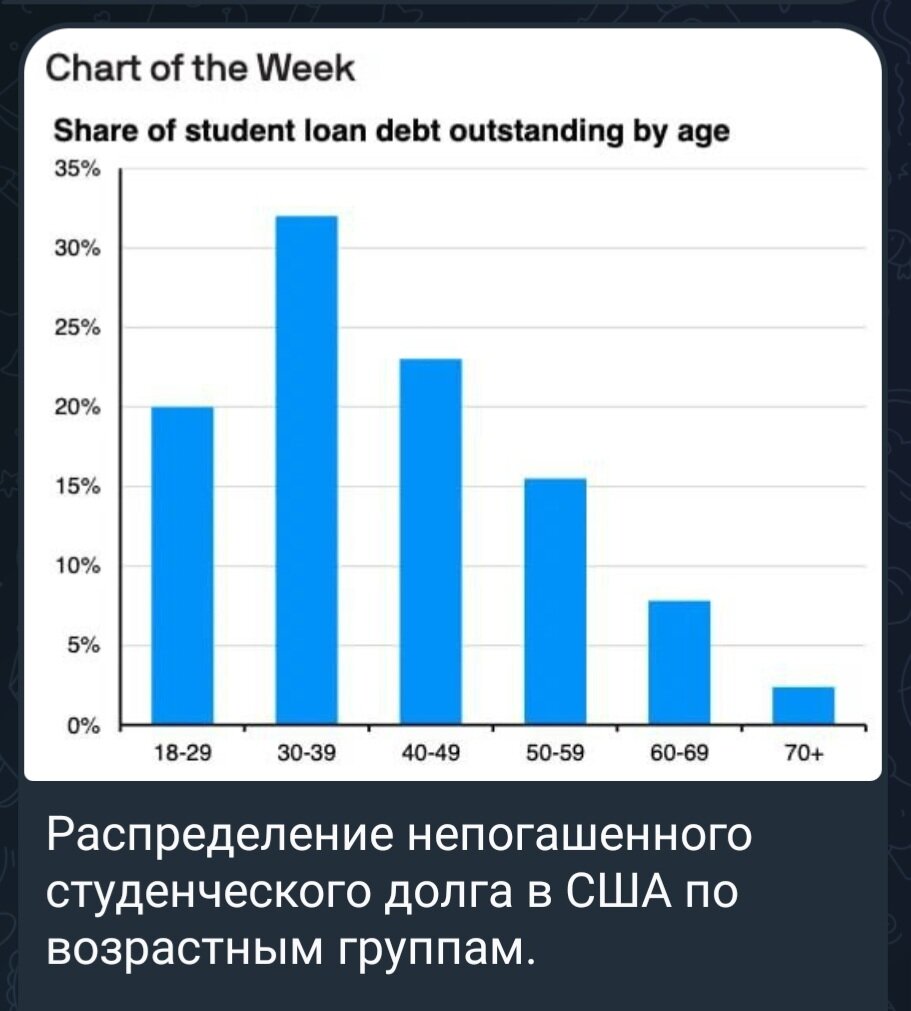 Намедни попался на глаза вот такой интересный график: То есть примерно половина получивших высшее образование (не факт еще, что образование, позволяющее резко стартануть в достижении Великой Мечты) погашает долг до 40 лет. Еще процентов 40 успевают его погасить как раз к пенсии (ежели таковая, конечно, имеется). А 10% продолжают погашать долг за свое высшее образование в преклонном возрасте - от 60 лет и далее. Пословицу - век живи - век учись - в данном случае можно переделать так: век живи - век плати за свое обучение в молодости. P.S. Стоимость и трудность получения высшего образования не гарантируют его высокого качества. Нигде и никогда.
