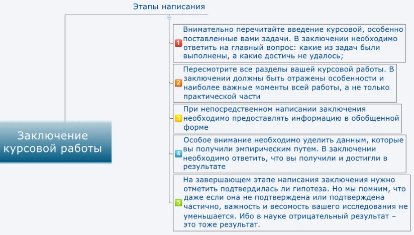 Заключение является обязательным разделом курсовой работы, где подводятся итоги исследования. Главная цель заключения - кратко и ясно передать основные результаты разработки, выдвинутые идеи и полученные выводы широкой аудитории заинтересованных читателей. Его основная задача заключается в убеждении читателей в обоснованности выводов и полезности проделанной работы. Содержание заключения Примерная структура заключительной части курсовой работы включает следующие элементы: Кроме того, желательно добавить раздел, посвященный анализу сложностей, возникших в процессе разработки темы. В этом разделе можно указать на нерешенные аспекты и объяснить причины, по которым не удалось исследовать определенные аспекты или какие проблемы возникли в процессе работы. Однако, необходимо сосредоточиться на достижениях, которые были получены при преодолении этих препятствий. Содержание заключения должно быть логически связано с введением и основной частью работы. Однако, простое копирование фрагментов из