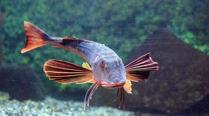 Если есть во Вселенной планета, на которой рыбы отрастили крылья, обзавелись ногами и не прочь на досуге ими поболтать, то тригла наверняка перенеслась к нам из этого чудесного мира. Всякий раз, когда удается увидеть эту необыкновенную рыбину, восхищаешься ее пестрой красотой, за которую она получила свое более известное имя – морской петух. Это довольно крупная рыба с максимальной длиной тела 75 см и массой в 6 кг. Внешность у нее действительно необычная и по-петушиному яркая. Большая голова странной треугольной формы, словно панцирем покрыта прочными костными пластинами. Верхняя губа большого рта раздвоена и гламурно сложена бантиком. Длинное веретенообразное тело «одето» в мелкую чешую. Спина рыбы окрашена в разные тона – от розового до красно-коричневого. Бока золотистые или бурые, а брюшко белое. Но главное украшение морского петуха – огромные, похожие на крылья, грудные плавники. Основной их фон разных оттенков фиолетового или голубого покрыт яркими зелеными либо красными пятна