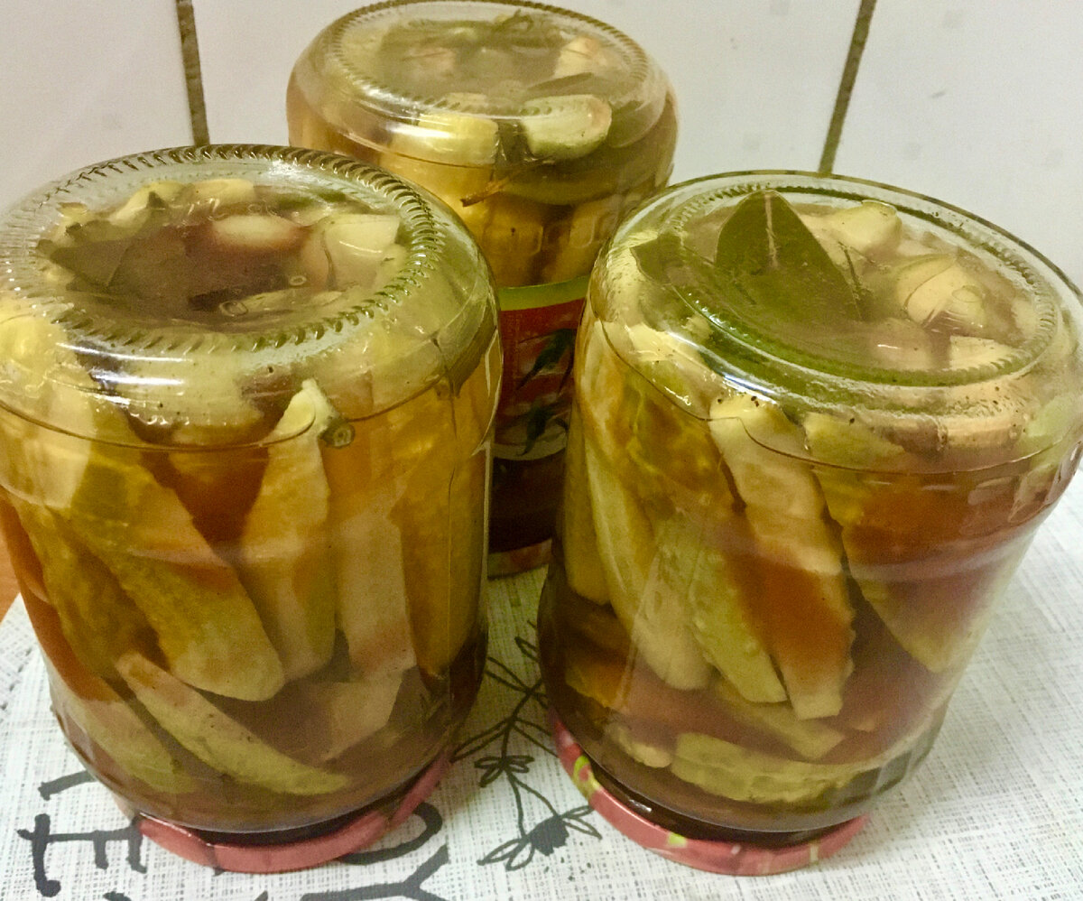 В чистые банки на дно кладём чёрный перец горошком, лавровый лист,укроп,петрушку. Укладываем порезанные дольками огурцы. Заливаем банки заранее приготовленной заливкой и ставим стерилизовать на 15 минут. Рецепт заливки таков: На 1,5 литра воды 200г.сахара 200г.томатной пасты 200г. уксуса 9% 2 ст.ложки соли Заливку довести до кипения и разлить по банкам. Железные крышки прикрыть сверху , не закрывая плотно. Для стерилизации составить банки в кастрюлю ,налить воды столько , чтобы банки утонули «по плечики».На дно кастрюли ,под банки , положите стерилизатор или постелите кухонное полотенце. Не опускайте горячие банки в холодную воду , чтобы стекло не треснуло от резкого перепада температуры.Вначале поставьте банки , потом аккуратно наливайте воду. Стерилизация начинается с момента закипания воды и черен 15 минут банки вытаскиваем, закрываем плотно крышки и переворачиваем крышками вниз.Не кутаем. После остывания банки убираем на хранение . Огурчики очень вкусные! Приятного аппетита