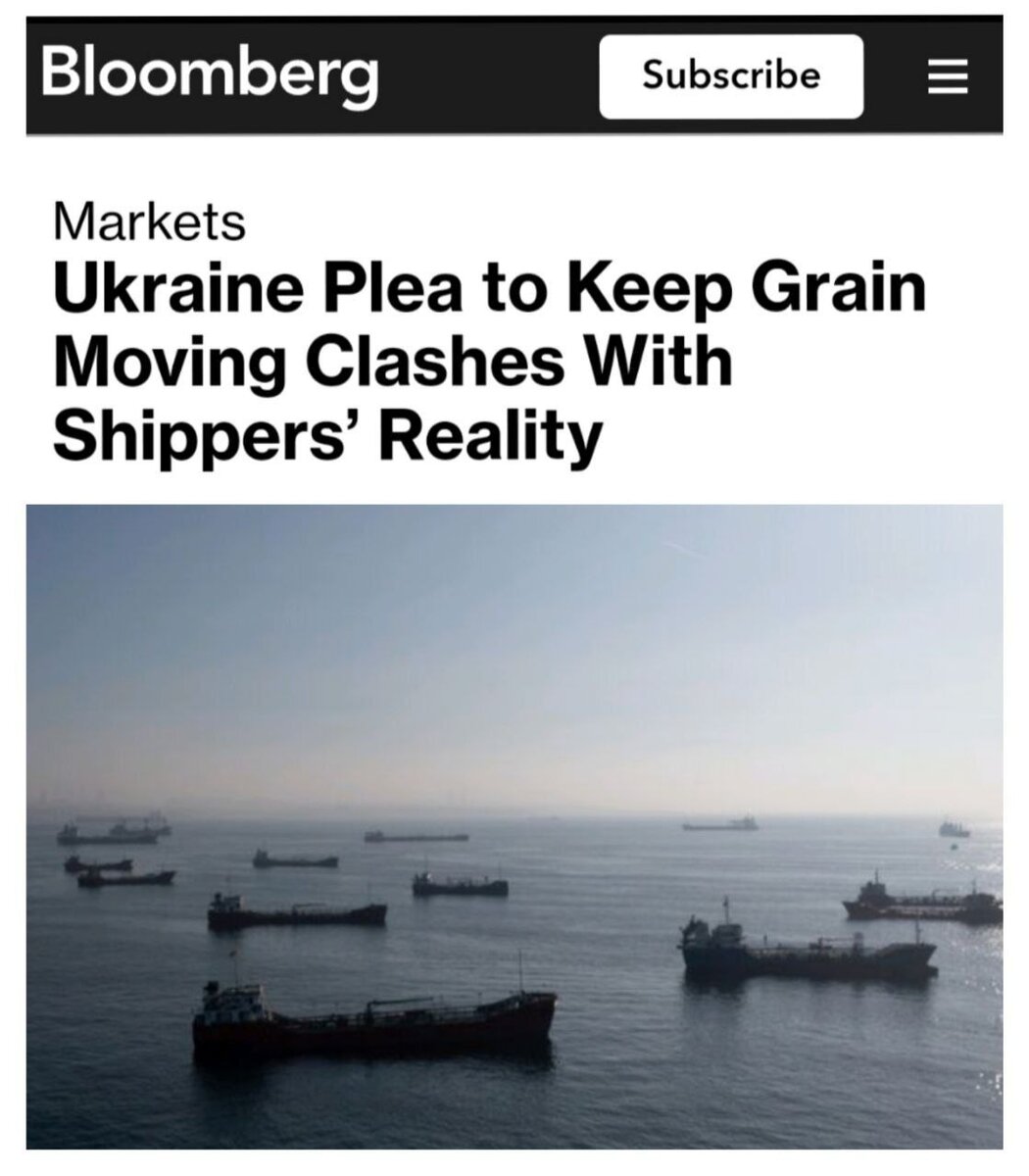Bloomberg пишет, что фантазии Зеленского продолжать зерновую сделку без России бессмысленны, никто не поплывет на Украину без российских гарантий.
