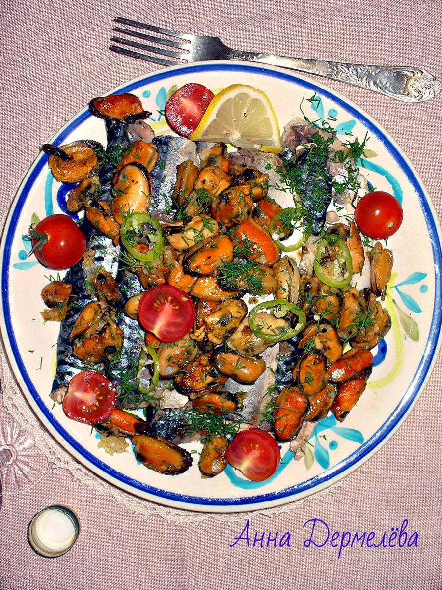 Отварная скумбрия, мидии с чесноком. А что это у нас на блюде, такое непонятное? А рыба отварная, практически диетическая. Из морской рыбы, если вы не живёте у моря, доступной осталась только скумбрия и селедка. Отварная скумбрия довольно вкусная, приправить ее можно по разному. Сегодня у меня вариант с мидиями. 3 скумбрии, 1/4 лимона, 5 горошин душистого перца, 1 см свежего горького перца, пол пучка укропа, 1 лавровый лист, соль, 2 зубчика чеснока. Скумбрию почистить, убрать голову и хвост. Сложить в кастрюлю, залить водой, добавить все продукты из списка. Сварить до готовности, не допуская сильного кипения. Остудить. Готовую рыбу разобрать на филе и сложить на блюдо. Полить лимонным соком, по вкусу. 1 ст ложка сливочного масла, 350 гр мидий варено / мороженых, соль, черный перец, 3 зубчика чеснока. Мидии полностью разморозить и аккуратно отжать. В сковороде распустить сливочное масло и обжарить мидии, до испарения лишней влаги. Посолить, поперчить. Готовые мидии слегка остудить и