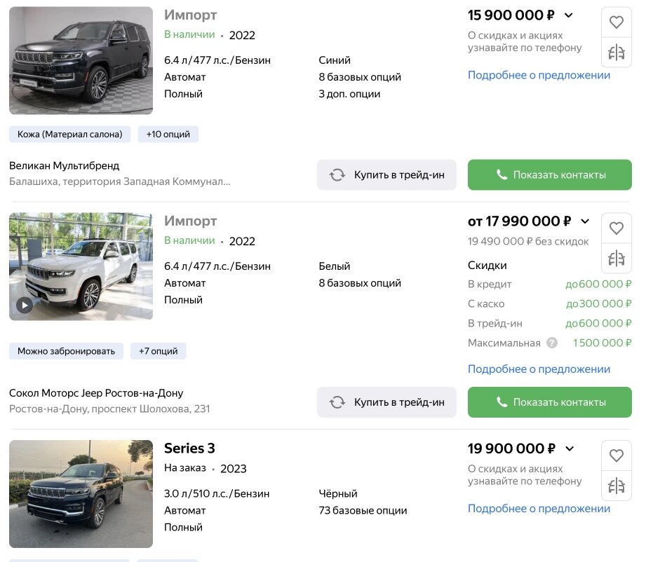 В 2021 году дебютировало две родственные модели – Jeep Wagoneer и Jeep Grand Wagoneer. Это самые дорогие и продвинутые внедорожники компании, причем имеющие рамную конструкцию (в отличии от того же Grand Cherokee). Технически Jeep Wagooner унифицирован с пикапом Ram 1500. Конкурентов у новинки от Jeep очень много – Cadillac Escalade, Chevrolet Suburban, Lincoln Navigator и Ford Expedition; поэтому Jeep Wagoneer придется сильно постараться и в 2023 году попробовать переломить проблемную для себя ситуацию, выражающуюся в постоянно падающих объемах продаж. Как ни странно, в России тоже можно купить новый Jeep Wagoneer в 2023 году. Редакция “GT-News.ru” проанализировала объявления машин привезенных по параллельному импорту – ориентировочная цена от 15 900 000 рублей (на топовый Grand Wagooner). Фотогалерея Видео тест-драйв Обзор После того, как в 2010 году был прекращен выпуск внедорожника Commander, поклонники марки Jeep фактически остались без больших семейных вездеходов. Ситуация начина