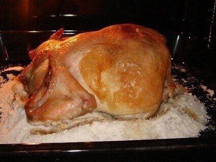 Курочка, запеченная на соли Проверенный временем рецепт приготовления курицы. Мясо получается в меру соленым, сочным, с аппетитной хрустящей корочкой. Очень вкусно, да и готовится предельно просто! Ингредиенты: Курица - 1 шт Соль - 1 кг (не Экстра) Способ приготовления: Шаг 1 Открываем пачку соли, высыпаем на противень. Берем курицу, если охота извращений сыплем специями любыми если неохота просто слегка солим сверху. Шаг 2 Водружаем курицу на высыпанную соль и ставим в духовку при 180-200 градусах. Время приготовления примерно полчаса - час (все зависит от веса курицы) . Предваряя вопросы отвечу - нет, курица не получается очень соленая, даже на спине на которой она лежит - нет, мазать майонезом, сметаной, медом и прочей мажущейся смесью не нужно - шкурка у курицы получается хрустящая - по вкусу это точная копия магазинной куры гриль. Приятного аппетита!