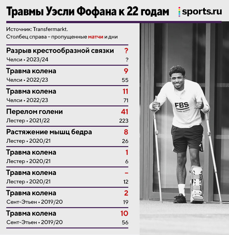 До этого ломал ногу. Перед стартом предсезонки «Челси» потерял самого дорогого защитника: Уэсли Фофана порвал кресты, ему уже сделали операцию. Обычно это минимум полгода восстановления. Хотя источник в медштабе клуба предполагает худшее: травма выглядит очень серьезно, Фофана может вернуться только к следующему лету. В прошлом сезоне защитник из-за травм пропустил 20 матчей – за «Челси» пока сыграл столько же. Для Фофана это уже вторая серьезная травма. В «Лестере» выпадал аж на 7 месяцев Фофана не позавидуешь: к 22 годам собрал уже такое количество травм, которое некоторые не получают за всю карьеру. Повреждения преследуют француза еще с «Сент-Этьена»: там он травмировал колено, причем дважды. Из-за этого в 2019-м пропустил аж 75 дней и 12 матчей. Дальше был «Лестер» – и те же проблемы. В сезоне-2020/21 Фофана дважды лежал с коленом и еще раз – с повреждением мышц бедра. Грустный итог – 44 дня без футбола (9 матчей). Но самую жуткую до недавнего времени травму Уэсли, как и сейчас, сл