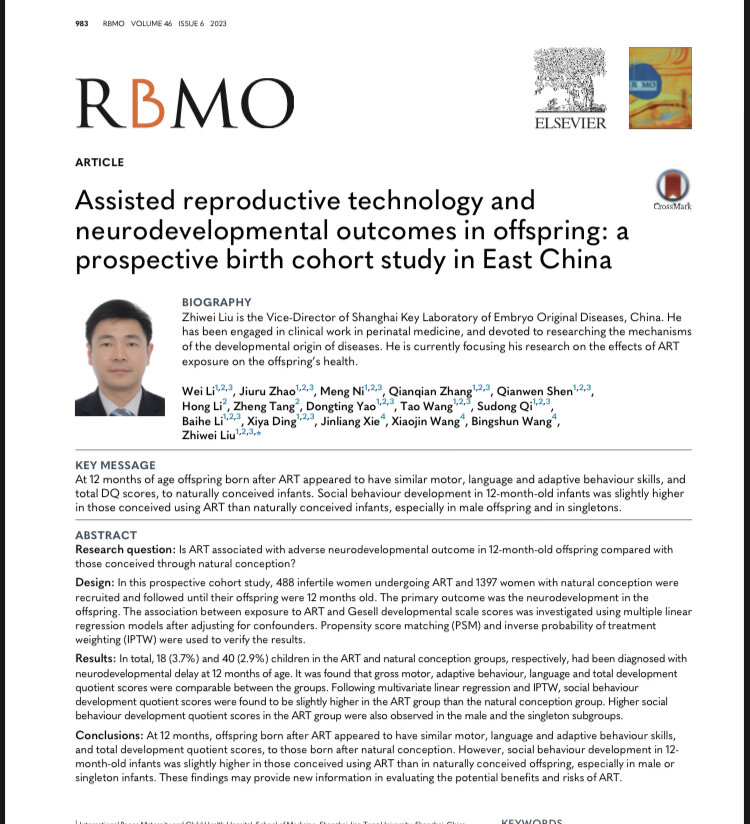 Вспомагателтные репродуктивные технологии( ВРТ), такие как ЭКО и ИКСИ широко используются для лечения бесплодия. По данным 2020 года более 8 миллион детей во всем мире рождены после применения программ ВРТ. Учитывая растущее число детей, зачатых с помощью ВРТ продолжается изучение влияния ВРТ на развитие и здоровье детей. В Восточном Китае было проведено проспективное когортное исследование, опубликованное в журнале RBMO 2023. 🔴 Цель исследования Установить связано ли ВРТ с неблагоприятным исходом развития нервной системы у 12-месячных детей по сравнению с детьми, зачатыми естественным путем? 📖В это проспективное когортное исследование были включены 488 женщин с бесплодием, прошедших ВРТ, и 1397 женщин с естественным зачатием, которые наблюдались до достижения их потомством 12-месячного возраста. Первичным результатом было развитие нервной системы у потомства. 🔴 Результаты. 📌 Всего у 18 (3,7%) и 40 (2,9%) детей в группах ВРТ и естественного зачатия соответственно была