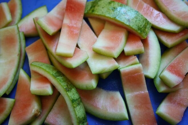 Арбузные корки являются прекрасной альтернативой огурцам. Вы можете использовать их вместе с другими летними ингредиентами. Такими как свежий сладкий перец и помидоры.