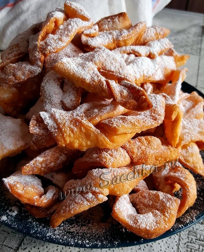 - Готовый хворост вынуть вилкой из жира на решето или бумагу и посыпать сахаром, истолчённым и смешанным с ванилином, цедрой или корицей.