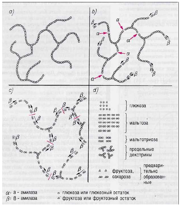 Важнейшей составной частью пива является спирт, образующийся при брожении сахаров. Поэтому предварительно необходимо расщепить крахмал до мальтозы, а в месте с ней всегда образуются промежуточные продукты – несбраживаемые декстрины. Крахмал должен быть без остатка расщеплён до сахаров и декстринов, не окрашиваемых йодном. Остатки крахмала могут дать в пиве клейстерное помутнение. Расщепление крахмала проходит три стадии и последовательность из неизменна: клейстеризация, разжижение, осахаривание. Температуры клейстеризации различны для каждого вида зерновых. Так, например крахмал солода и ячменя клейтеризуется в присутствии амилаз при 60°С. После извлечения крахмала и разжижения затора происходит его осахаривание – это расщепление молекул крахмала до сахаров. Это происходит под воздействием ферментов, в частности, за образование сахаров отвечают амилазы. Работают они в диапазоне температур от 60° до 76°С. Существуют два вида таких ферментов β-амилаза – производит мальтозу при этом образ