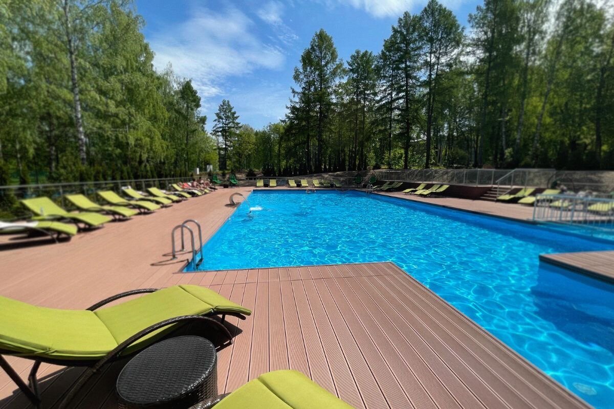 Бассейн открыт для посещения круглогодично — в нем будет комфортно плавать не только летом, но и зимой. Только представьте: вы плещетесь в теплой воде, а вокруг — шумят листвой деревья и поют птицы…