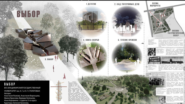 Студенты-архитекторы ВлГУ участвовали во Всероссийском архитектурном конкурсе «Без срока давности. Минута молчания». Пятеро учащихся показали своё мастерство вместе с научными руководителями – старшим преподавателем кафедры архитектуры Евгенией Куликовой и доцентом Аллой Черепушкиной. Молодые архитекторы объединили все свои работы в один проект, в него вошли «Детство», «Книга скорби», «Сад потерянных душ», «Течение времени» и «Выбор». Последний арт-объект собираются установить на постоянной основе во Владимире, а четыре других сделать в виде мобильных конструкций. Их можно будет перемещать в районы Владимирской области. Работа архитекторов получила высокую оценку, её отобрали в финал, а команду наградили в Музее Победы в Москве. Правительство Владимирской области совместно с городской администрацией областного центра собирается проработать возможность установки арт-объекта в парке «Патриот».