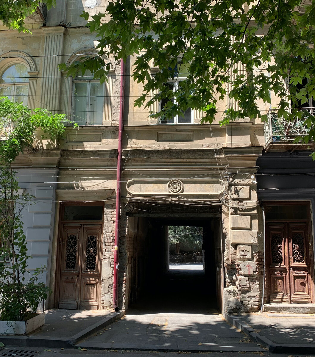 Утром я подхожу к стеклянной входной двери и фотографирую вот эту арку с двумя дверями из пересохшего дерева, и питаю иллюзию, что в арке вижу Тифлис, тот, что был здесь до построек этих домов, которые , как я уже сказал, давно отпраздновали свой столетний юбилей.